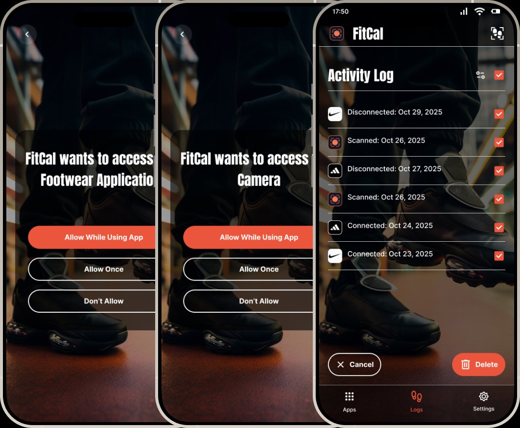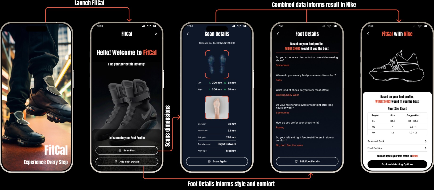 FitCal is an AR smart plugin designed for existing footwear brands’ mobile apps. It includes AR foot scanning and device camera calibration for accurate 3D foot measurements and integrates a foot condition quiz for inclusivity. AI analyzes brand-specific sizing data to suggest personalized footwear recommendations. It enhances user trust and reduces returns.