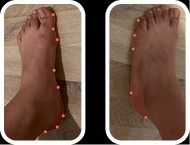Using AR frameworks such as ARKit (iOS) or ARCore (Android), the system projects depth maps to detect the foot’s outline, contours, and elevation points. The foot’s length, width, and arch height are extracted by aligning depth data with a 3D coordinate system based on the camera’s reference frame.